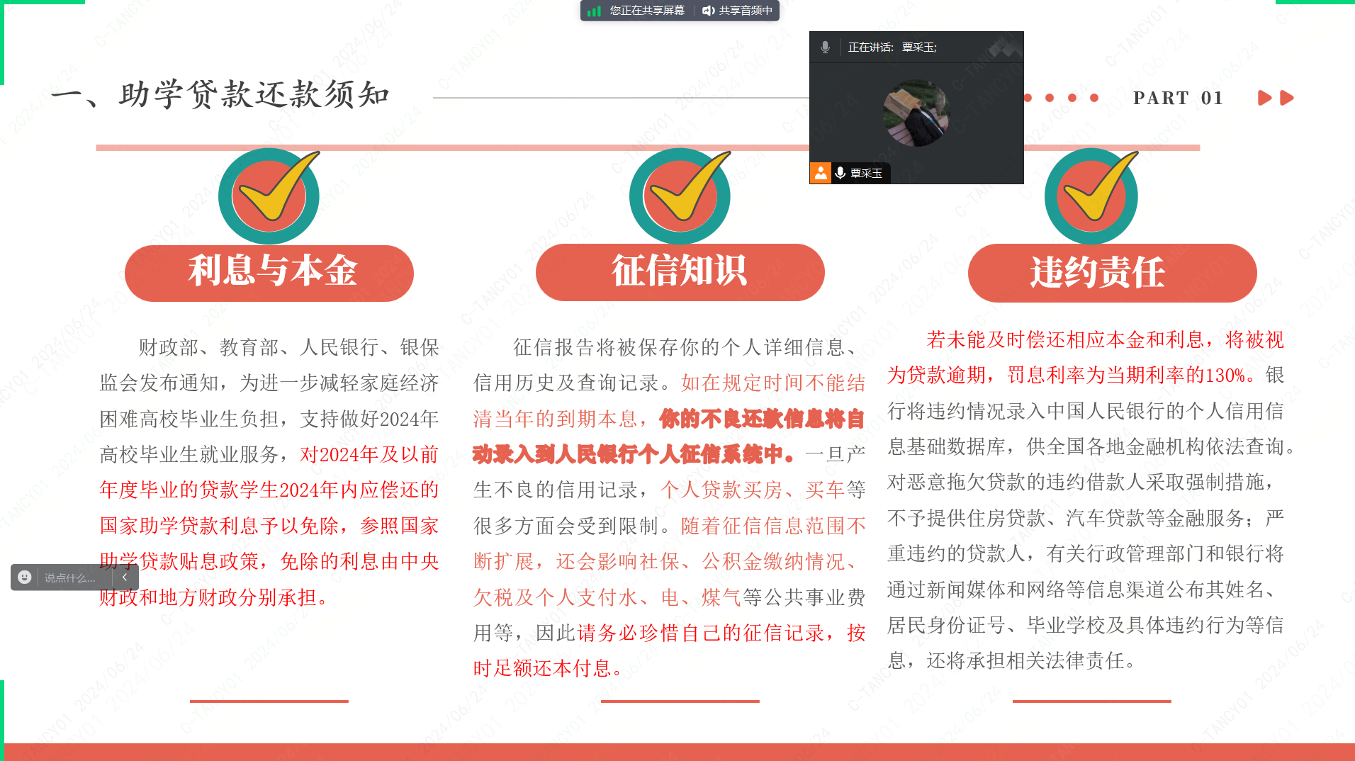 为深入贯彻落实学校助学贷款政策及相关文件精神,深化资助育人工作,进一步加强对毕业生诚信、感恩、励志教育,学院于6月20日-6月30日组织各班毕业生结合实际情况利用线上方式召开2024届贷款毕业生诚信还款主题教育活动。会议旨在讲解助学贷款还款的相关知识,让贷款毕业生更好地了解助学贷款政策、还贷操作流程和注意事项等知识,增强其诚信还款的意识,确保我院2024届毕业生助学贷款毕业确认及诚信教育工作顺利开展。