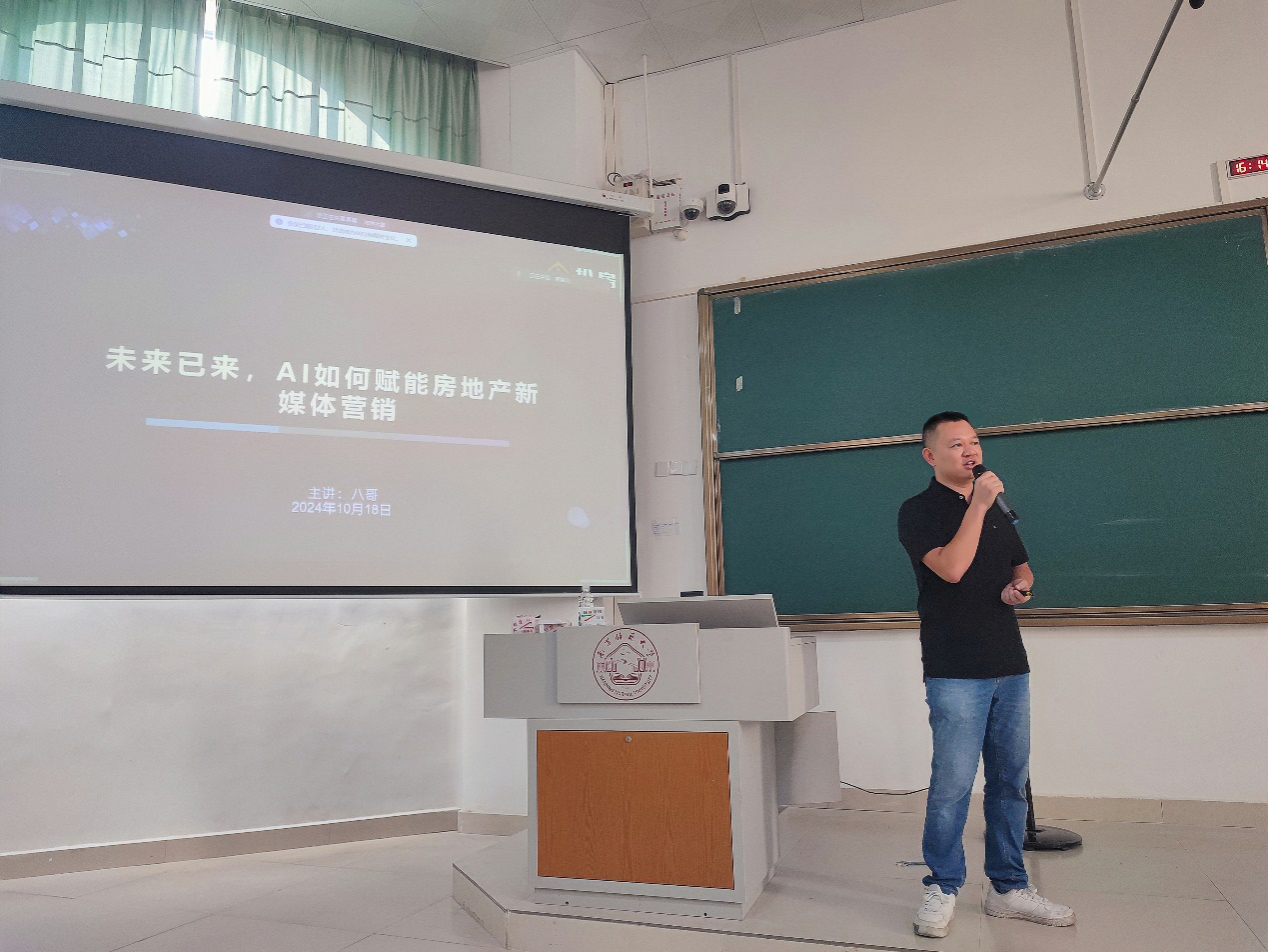 2024年10月18日,betway必威西汉姆联在武1-214教室举办了主题为“未来已来AI如何赋能房地产新媒体营销”的专题讲座。本次讲座特邀广西三人行信息科技有限公司吴天亮总经理主讲,betway必威西汉姆联副院长杨小雄教授、黄乐老师出席讲座,2022级、2023级、2024级学生积极参与讲座。