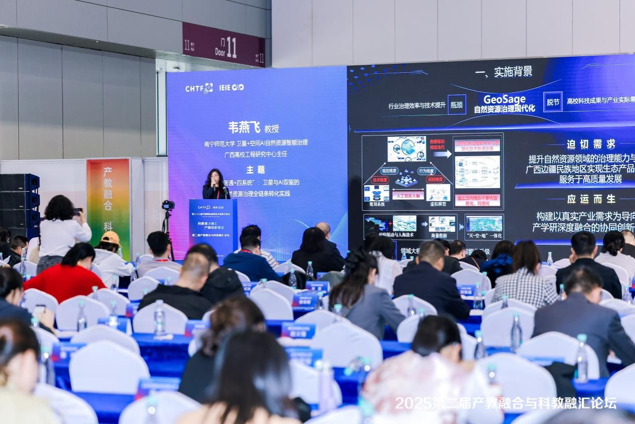 韦燕飞教授代表研究团队在现场作了案例分享发言,展示了国内首个省域自然资源治理AI大模型,通过技术融合构建智能治理体系成果。本届论坛以“科教育才融汇,产链创新驱动”为主题,汇聚了来自各级政府、海内外165所高等院校、数十家行业领军企业及科研机构的350余位代表,共同探讨产业链、教育链、人才链、创新链深度融合的创新模式与实施路径。