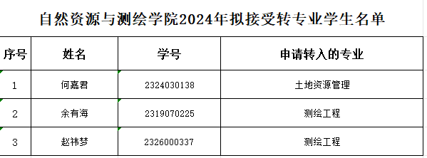 根据《关于做好2024年普通高等教育本科生转专业工作的通知》(教务处发[2024]55号)、《关于加强2024年转专业考核管理和监督的通知》(教务处发[2024]69号)《南宁师范大学普通高等教育本科生转专业管理规定(试行)》(南师教字[2022]22号)文件要求,betway必威西汉姆联于2024年5月对全校申请转入土地资源管理专业的3人、测绘工程专业3人分别进行考核。经过综合考核,拟同意何嘉君学生转入2023级土地资源管理专业,余有海、赵祎梦同学转入2023级测绘工程专业。具体名单详见附件。